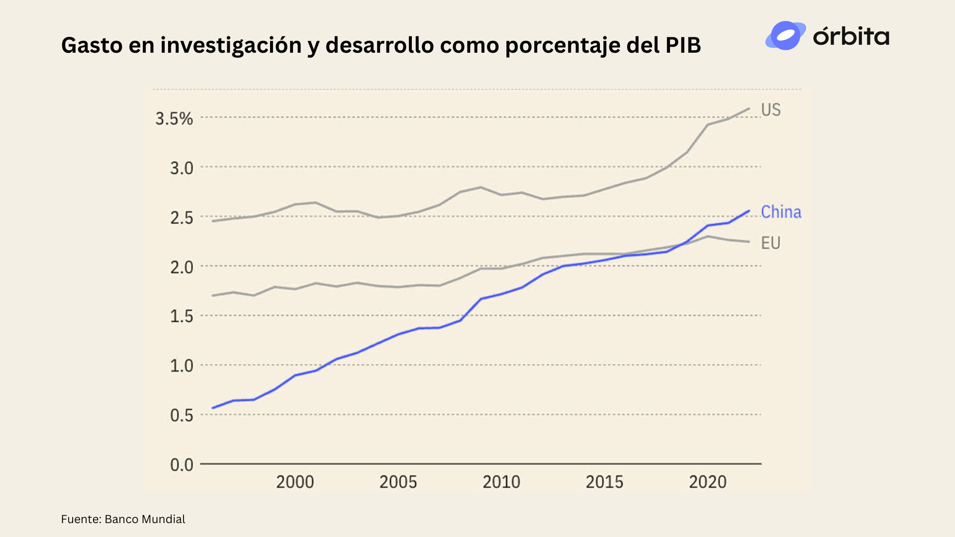 En los últimos 30 años, China cuadriplicó su inversión en investigación y desarrollo como porcentaje del PBI, mientras que la Unión Europea se mantuvo constante. En el contexto de un crecimiento “a tasas chinas”, esto significa un aumento exponencial de la investigación en ciencia y tecnología. Estados Unidos ahora gasta cerca del 3.5% de su PBI en investigación y desarrollo, aumentando 1% comparado con principios de los 2000.