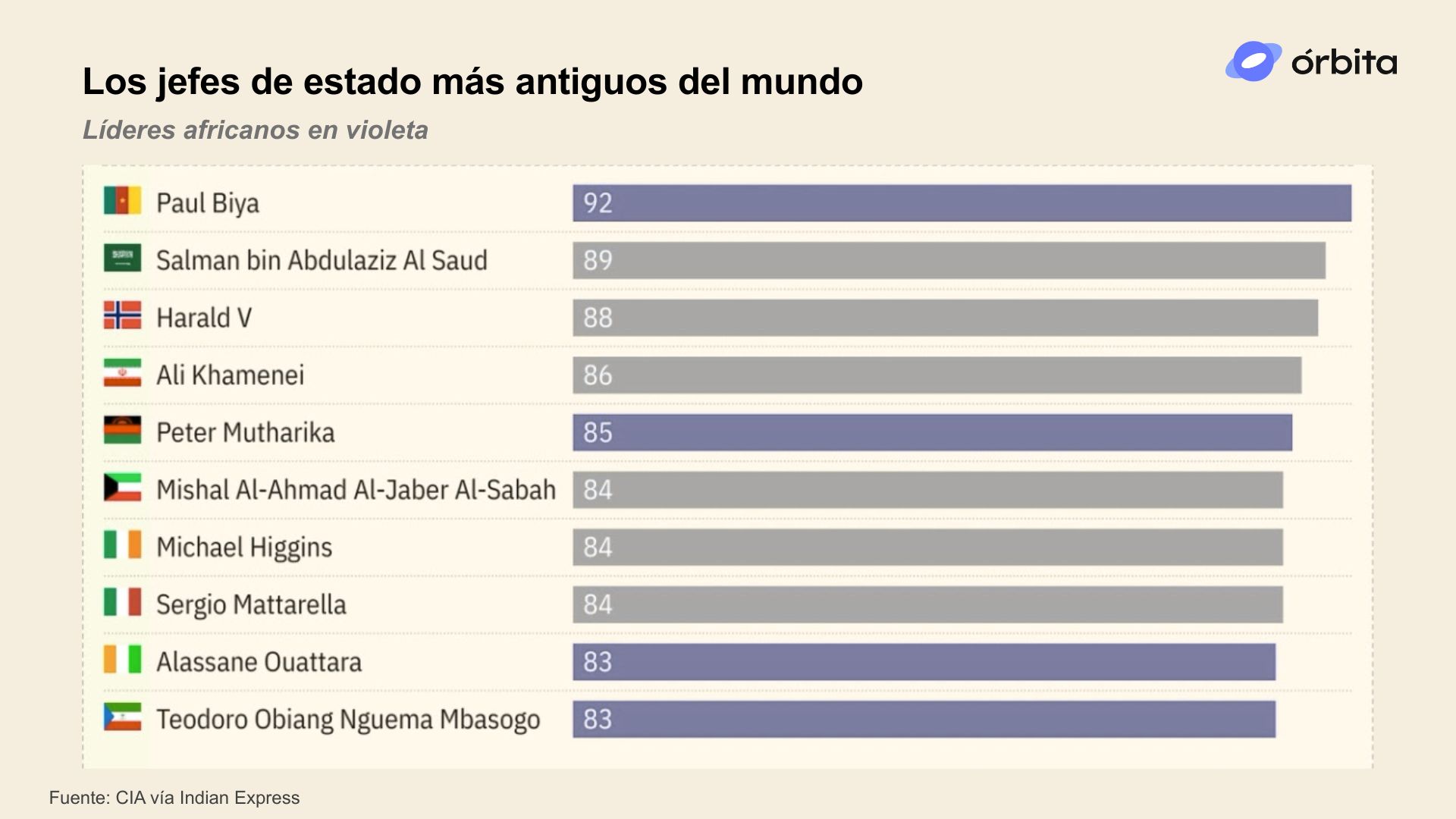 Paul Biya, presidente de Camerún desde 1982, encabeza la lista con 92 años. Le siguen el rey Salman de Arabia Saudita (89) y el monarca noruego Harald V (88). Entre los diez mandatarios más ancianos, cuatro son africanos. Una contradicción respecto al continente más joven del mundo donde 60% de los habitantes tienen menos de 25 años.