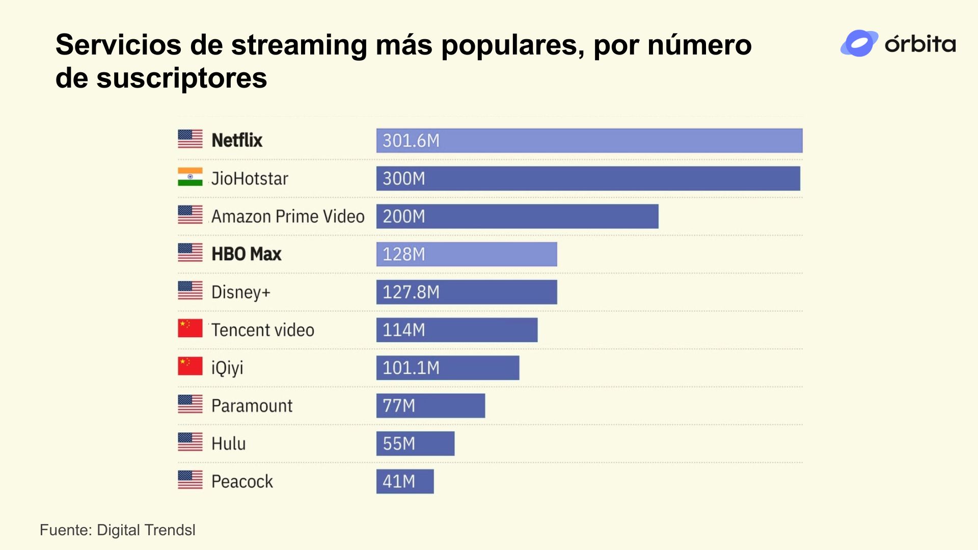 Netflix, que este fin de semana anunció que adquira a Warner Bross, aún lidera como el servicio de streaming con mayor cantidad de suscriptores. La plataforma india JioHotstar ya casi iguala a Netflix en tamaño. Plataformas chinas como Tencent Video e iQiyi también entran en el top global, revelando un mercado de streaming cada vez más multipolar.