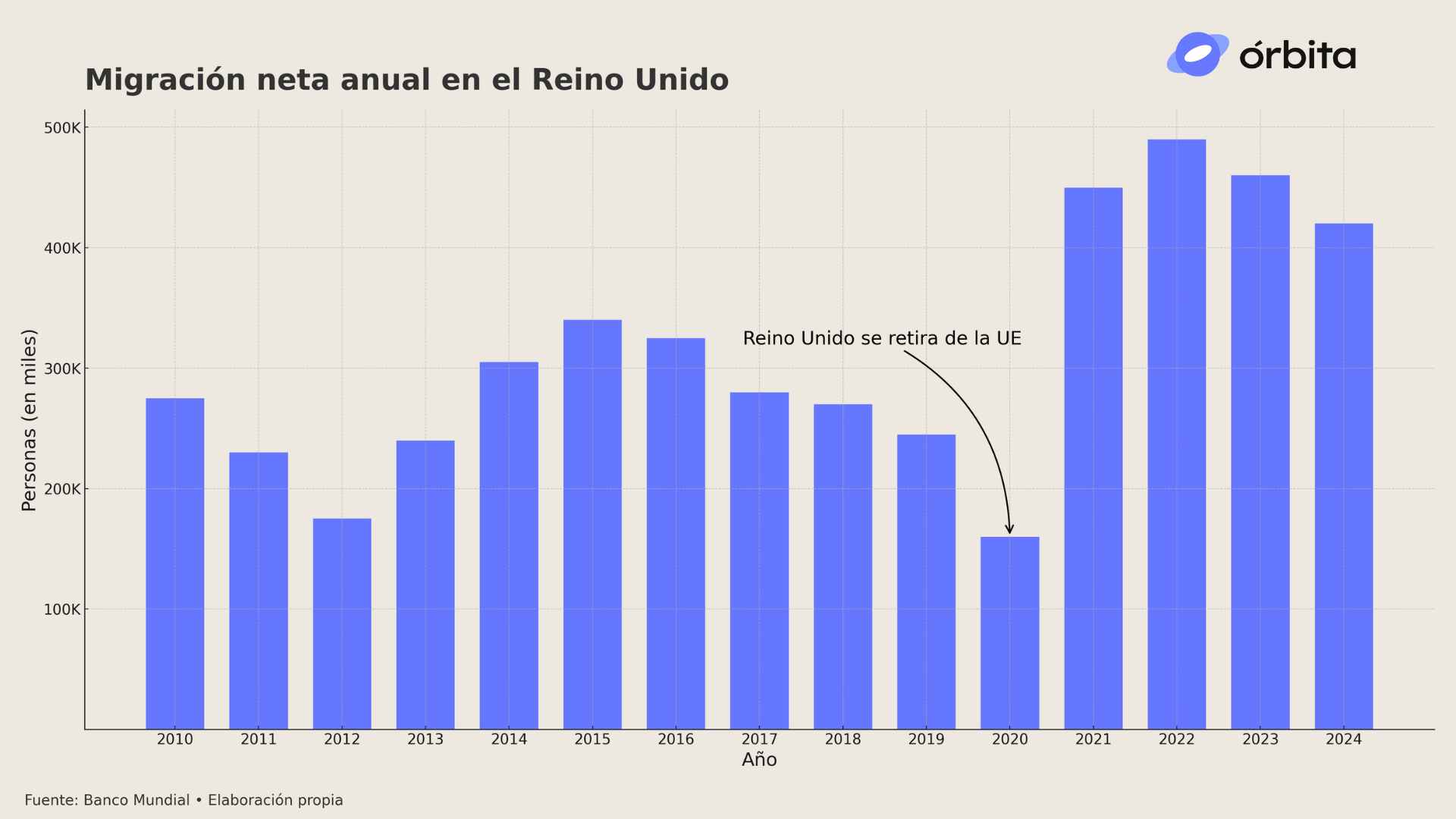 Según los datos del Banco Mundial, la migración neta al Reino Unido alcanzó un récord cercano al medio millón de personas en 2022, a pesar del Brexit. Tras la salida de la Unión Europea en 2020, lejos de caer, los flujos migratorios repuntaron con fuerza, marcando una paradoja entre el discurso político y la realidad demográfica.