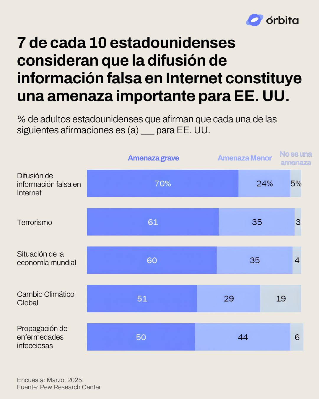 El 70% de los estadounidenses considera que la difusión de información falsa en Internet es una amenaza grave, por encima del terrorismo y la economía global. ). El dato marca un cambio de época: las amenazas percibidas se desplazan del plano físico al digital, donde la disputa ya no es solo por territorios, sino por narrativas, opinión pública y legitimidad política. En ese terreno, actores estatales y no estatales pueden influir, desestabilizar y condicionar decisiones políticas sin recurrir a la fuerza tradicional, redefiniendo qué significa hoy “seguridad nacional”.