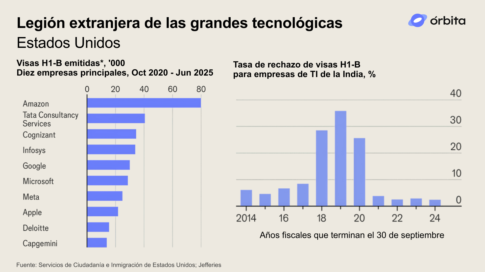 Entre 2020 y 2025, las diez principales empresas concentraron decenas de miles de permisos laborales, con Amazon muy por encima del resto. Al mismo tiempo, las firmas indias enfrentaron picos de rechazo en 2018-2019, reflejando tensiones en la política migratoria y la dependencia de Silicon Valley de ingenieros extranjeros.
