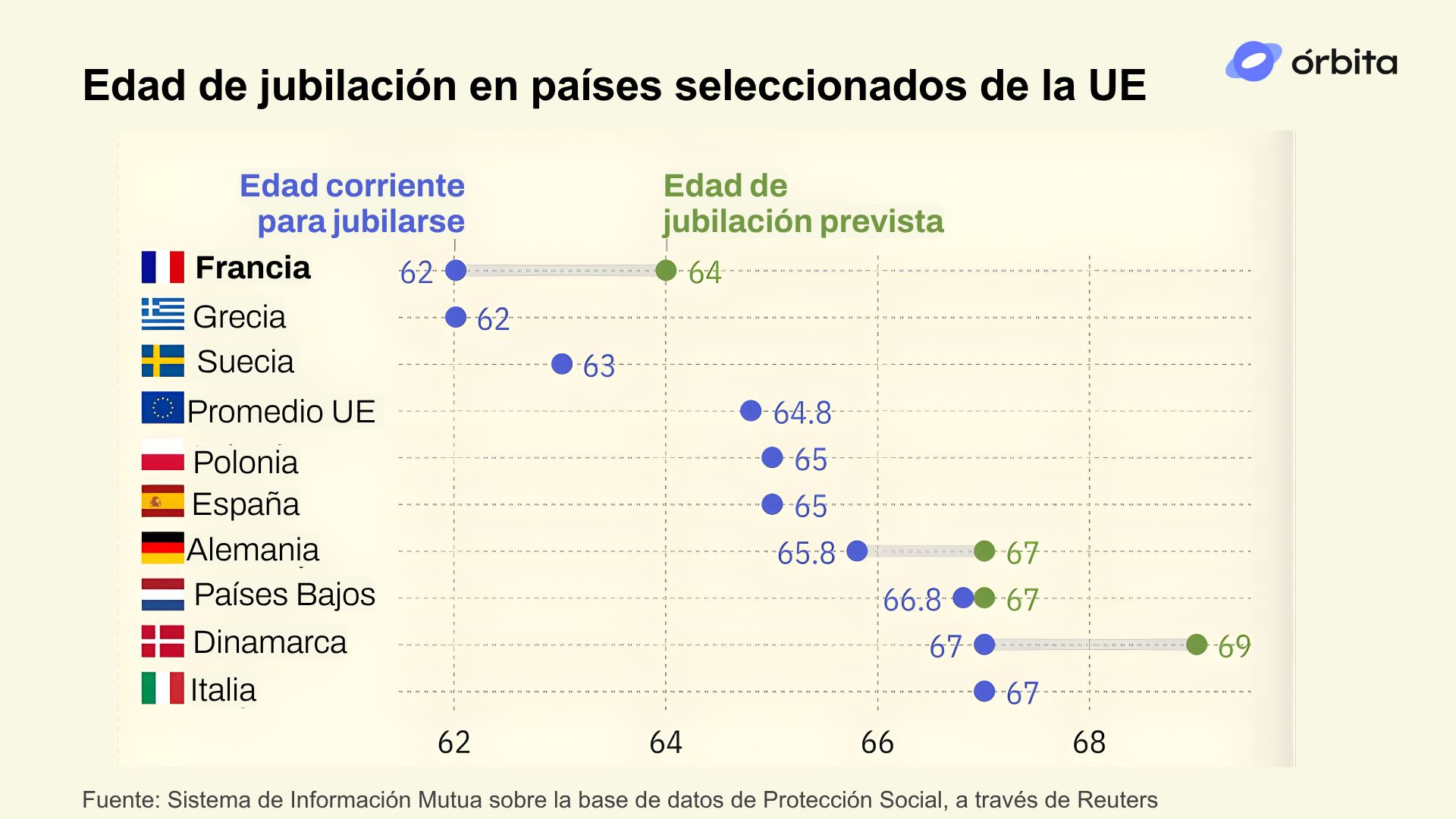 Esta semana, Francia dio marcha atrás con la reforma que buscaba elevar la edad mínima de jubilación de 62 a 64 años. Incluso si se hubiera implementado, Francia seguiría por debajo del promedio europeo, que ronda los 64,8 años. En Argentina, en cambio, la edad jubilatoria es de 60 años para las mujeres y 65 para los hombres. Los países con las edades más altas de retiro en Europa son Italia y Dinamarca, con 67 años, y los Países Bajos, con 66,8.