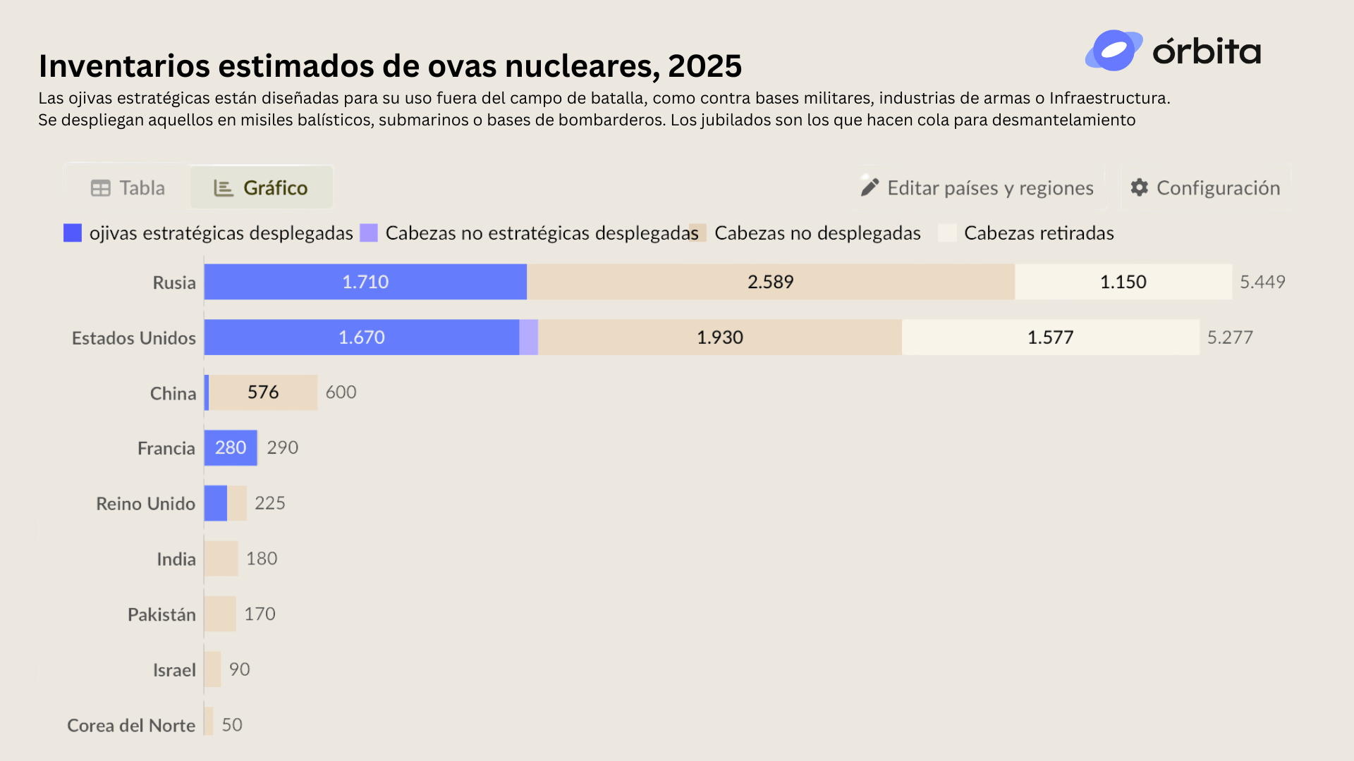 Según Our World in Data, Rusia y Estados Unidos acumulan más del 85% de las ojivas nucleares del mundo. China emerge como tercer actor, mientras que el resto de los países con armas nucleares mantienen arsenales mucho menores, en torno a las pocas centenas. La brecha ilustra cómo la disuasión global continúa siendo un juego dominado por dos, con crecientes tensiones ante la modernización de los arsenales.